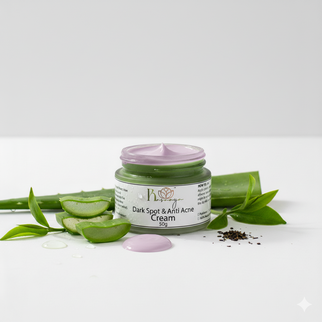 Rasaaya Dark Spot & Anti-Acne Cream is a gentle yet effective Ayurvedic formulation designed to target acne, fade dark spots, and soothe irritated skin. Powered by kojic acid, cucumber powder, 2% hyaluronic acid, tea tree extracts, rosemary essential oil, and aloe vera, this cream works to clarify your complexion without stripping or drying it out.